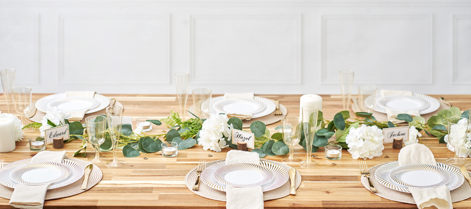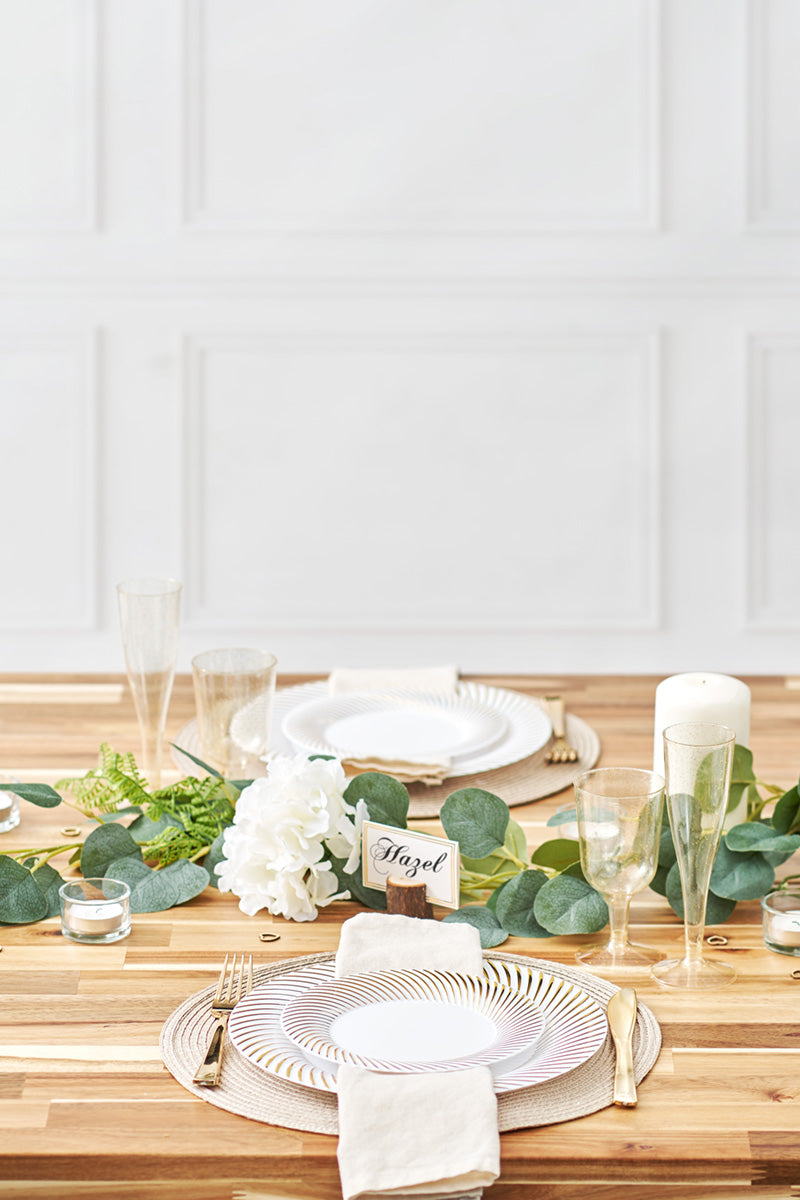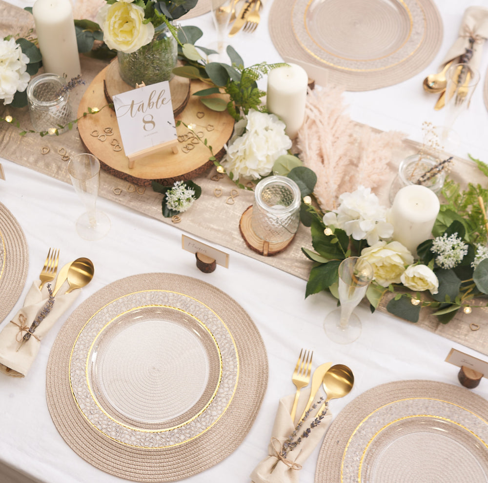 Reusable Plastic Plate Set, Transparent with Hammered Gold Rim Design