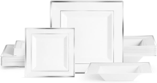 Reusable Dinnerware Set with Silver Rim - Plates & Bowls - 60 Pack