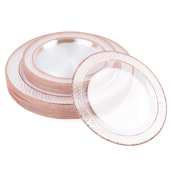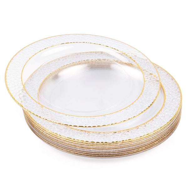 Reusable Plastic Plate Set, Transparent with Hammered Gold Rim Design