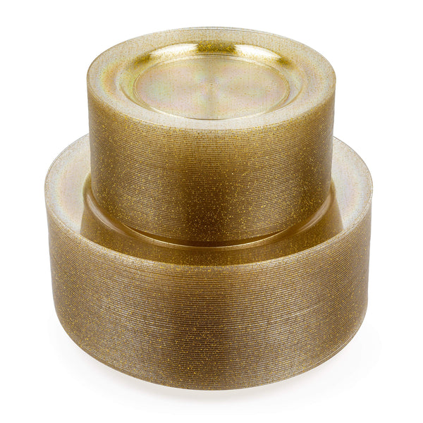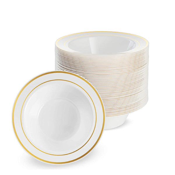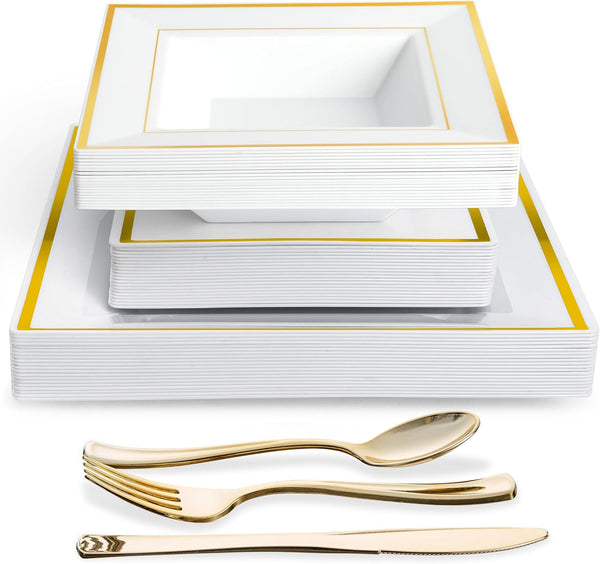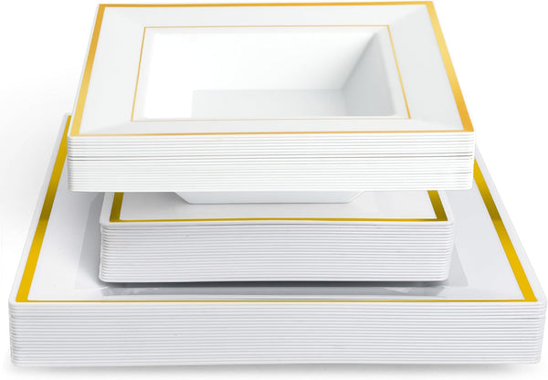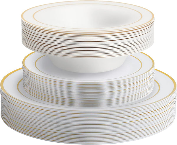 Reusable Dinnerware Set with Gold Rim – Plates & Bowls - 120 Pack