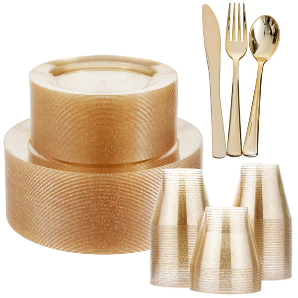 Reusable Dinnerware Set with Gold Rim - Plates, Bowls, & Cutlery - 360 Pack