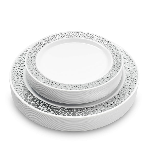 Reusable Plastic Silver Lace Rim Dinner & Dessert Plate Set